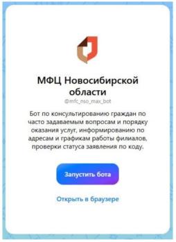 Через чат-бот МФЦ НСО вы можете получить информацию об услугах, режиме работы филиалов, проверить статус дела. С декабря 2025 года будет доступна функция-предварительная запись в филиалы МФЦ НСО. Канал МФЦ НСО в МАХ: https://max.ru/gau_nso_mfc